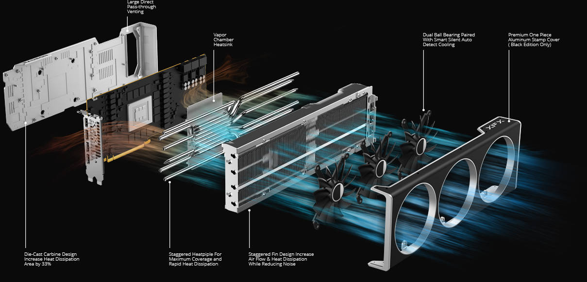 The XFX 7900 Series brings back the vapor chamber design, a more efficient method for heat dissipation than traditional cold plates alone. The vapor chamber can quickly quickly and efficiently transfer heat from the GPU and VRAM to the heat pipes, and then into the heatsink assembly.