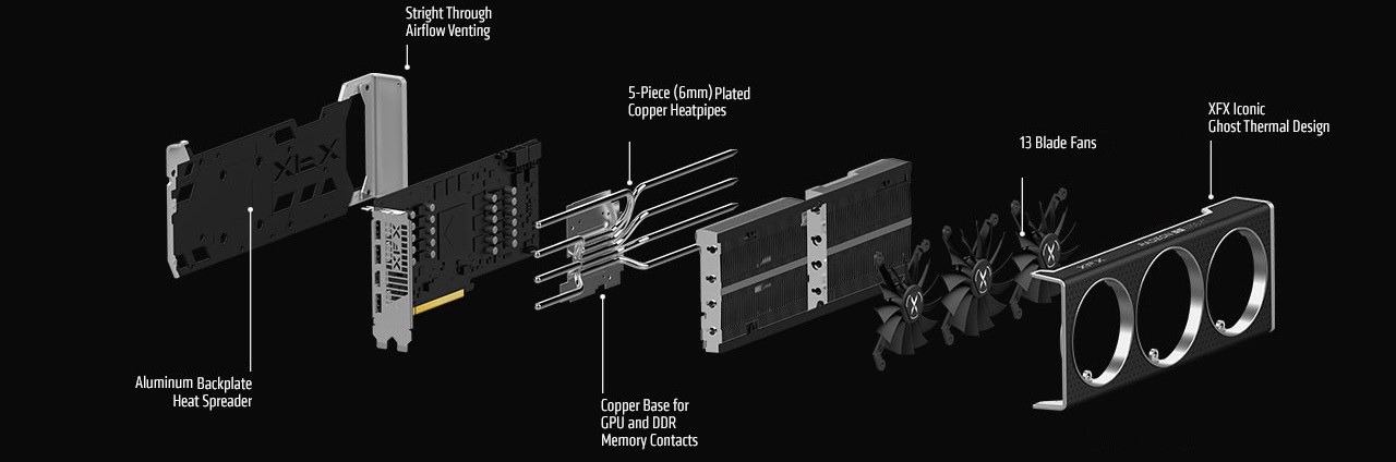 XFX's all new Ghost Thermal design cools your GPU better than ever before. Our new design features a straight through airflow venting to significantly improves cooling and compliments open design of the Ghost Thermal floating shroud design. Our new 13 blade fans increase total air flow and provides long lasting quieter operation.