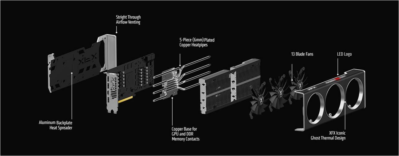 XFX's all new Ghost Thermal design cools your GPU better than ever before. Our new design features a straight through airflow venting to significantly improves cooling and compliments open design of the Ghost Thermal floating shroud design. Our new 13 blade fans increase total air flow and provides long lasting quieter operation.