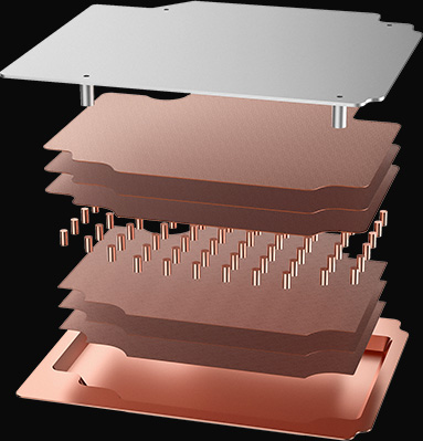 The XFX 7900 Series brings back the vapor chamber design, a more efficient method for heat dissipation than traditional cold plates alone. The vapor chamber can quickly quickly and efficiently transfer heat from the GPU and VRAM to the heat pipes, and then into the heatsink assembly.