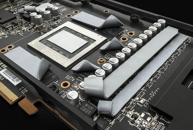 XFX maximizing the cooling effectiveness of our cards by increasing the number of thermal padding throughout the card. This includes thermal pads on all VRM's, Memory, and GPU on all sizes of the PCB board. Ensuring stable high quality performance.