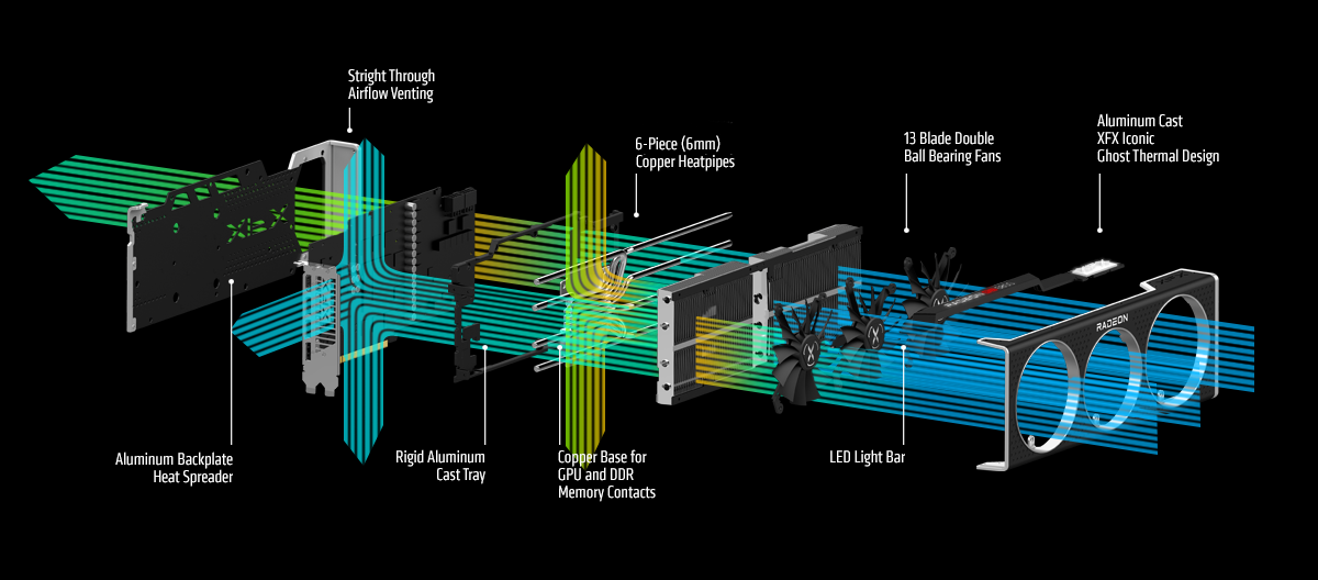 XFX's all new Ghost Thermal design cools your GPU better than ever before. Our new design features a straight through airflow venting to significantly improves cooling and compliments open design of the Ghost Thermal floating shroud design. Our new 13 blade double ball bearing fans increase total air flow and it's double ball bearing design provides long lasting quieter operation.